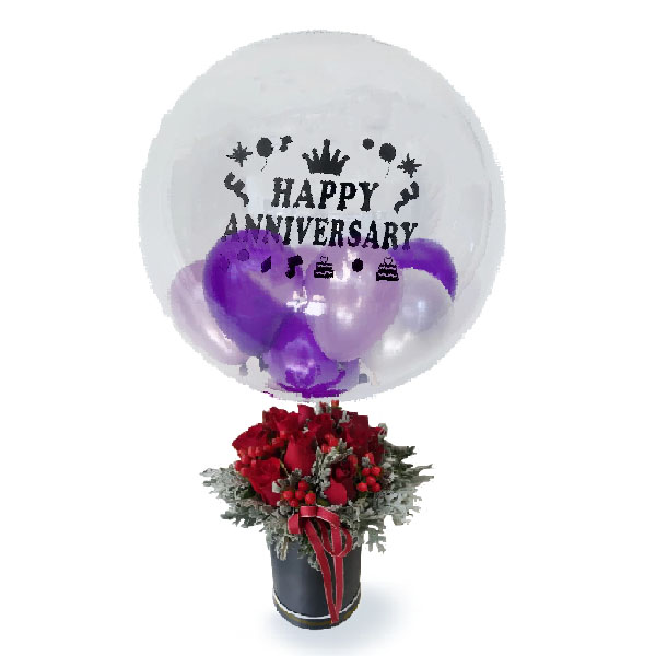 A timeless gift of fresh roses in a box featuring a trendy balloons in Balloon design bouquet. Made for all celebrations, be it Birthday, Anniversary, Congrats and more,this 24" Anniversary Blooming Balloons in Balloon with fresh Red Roses send jovial Happy Anniversary Wishes to your recipient. Our transparent globe balloon 24" is air-filled and stuffed with mini balloons. The mini balloons come in various colors and will be matched with matching ribbons and colored box.
