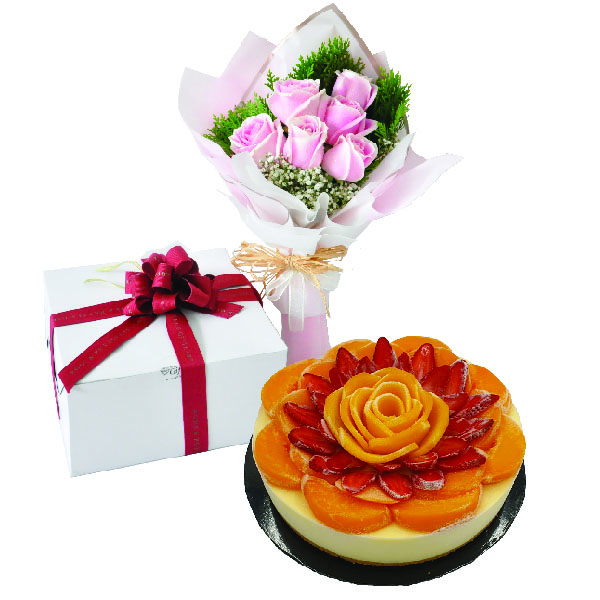 The best no-bake cheesecake in town with a buttery digestive biscuits base, topped with selected juicy fruits. Perfect to warm someone's heart on special occasion, this Mouth-watering Berry Peachy Mango Cheese Cake 1kg comes with a posy of Sweet Roses. Our Vegetarian no-bake Cheese Cakes are Eggs-free and we takes all precaution to ensure food items are suitable for Vegetarian. However, note that the cakes may contain dairy products, nuts or traces of nuts product.