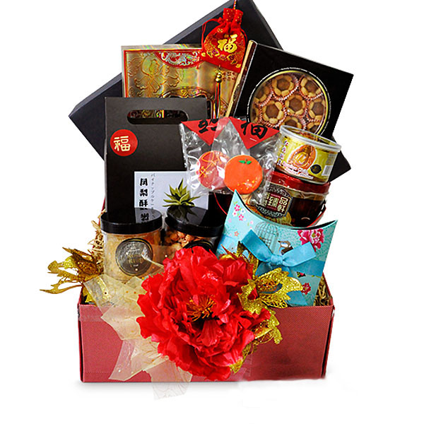Braised Abalone 4s 四头鲍鱼 160g, Gold Rose Bud Tea 金玫瑰茶 100g, Almond Cake 杏仁饼 160g, Milk Nougat Fudge 牛轧糖 138g, Pineapple Tarts 风梨酥 200g, Walnut Black Sesame Cake 核桃芝麻糕 180g, Roasted Pistachio Nuts 开心果 148g, Pineapple Slices 风梨片 148g and Red Dates with Walnuts 核桃红枣 68g. Blessed Wishes Greeting of good fortune food gift will be accessorized with oriental trimmings & ribbon.