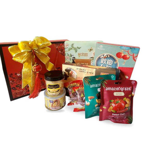 Chile Golden Abalone 4s 四头鲍鱼 160g, Macau Apricot Kernel Almond Cake 杏仁饼 200g, Melaka Kueh Bangkit 番婆饼 150g, Amazing Graze Sweet Chilli Mix Nuts 30g, Amazing Graze Miso Seaweed Almond, Cashews & Sunflower 30g, Barbequed Fish Satay 沙爹烤鱼 60g, Pineapple Slices 风梨片 148g and Red Dates with Walnuts 核桃红枣 50g.