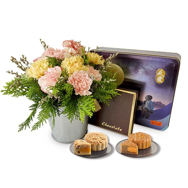 Royce 'Real' Chocolate with Strawberry & Lemon Cream 9pcs, a box of 友爱 Yu Ai Assorted Mooncake 月饼 4pcs and Carnation flowers. Mooncakes come with four tempting varieties - our all time favorite Tiramisu Walnut Mooncake, Pure Lotus 1 Yolk, Red Bean Special and Durian Mung Bean Special. Our traditional Mooncake Gift are designed to impress. Note that Yu Ai traditional Mooncakes are Halal certified