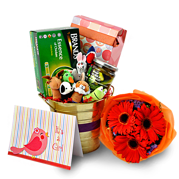 Pamper new Mom with Brands Essence of Chicken 70g X 6btls, Beechworth Bee Cause Outback Honey 240g and welcome little miracle with Happy Animal Rotating Hanging Baby Rattle Plushies. Gifts is accompanied by a chic Personalized It's A Girl or A Boy Congrats Baby Birdy Card to give a big welcome to little miracle's entry into this world.