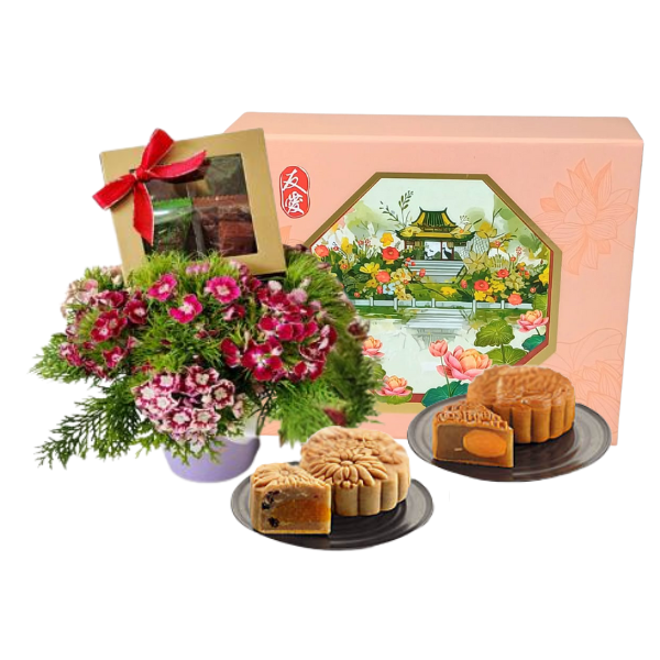 Send a cheery posy of Sweet Williams Flowers with Royce Royce® (Hokkaido) Aroma Chocolates - Madagascar, Ecuador, Matcha and Criollo Cacao Milk Pralines 12pcs and a box of 友爱月饼 Yu Ai Mooncake in a box of 4 - our all time favorite Tiramisu Walnut Mooncake, Pure Lotus 1 Yolk, Red Bean Special and Durian Mung Bean Special. Note that Yu Ai traditional Mooncakes are halal certified.